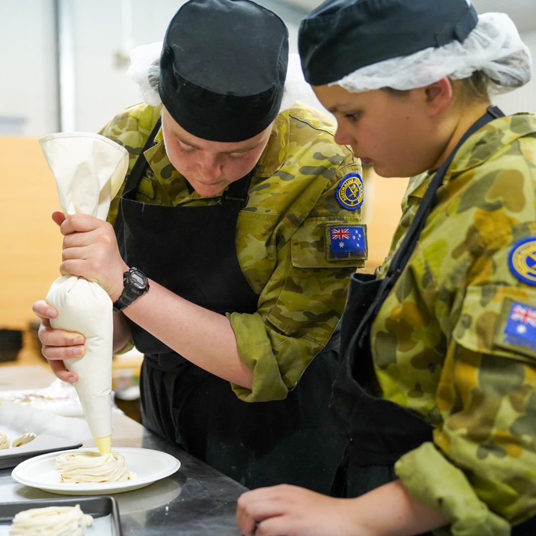 Mechanics course cadets change a tyre; Cadet Meinharat and Cadet Anderson bake a cake from their supplies; and catering cadets cook up a storm. Photos: Australian Army Cadets South Australia/Facebook.