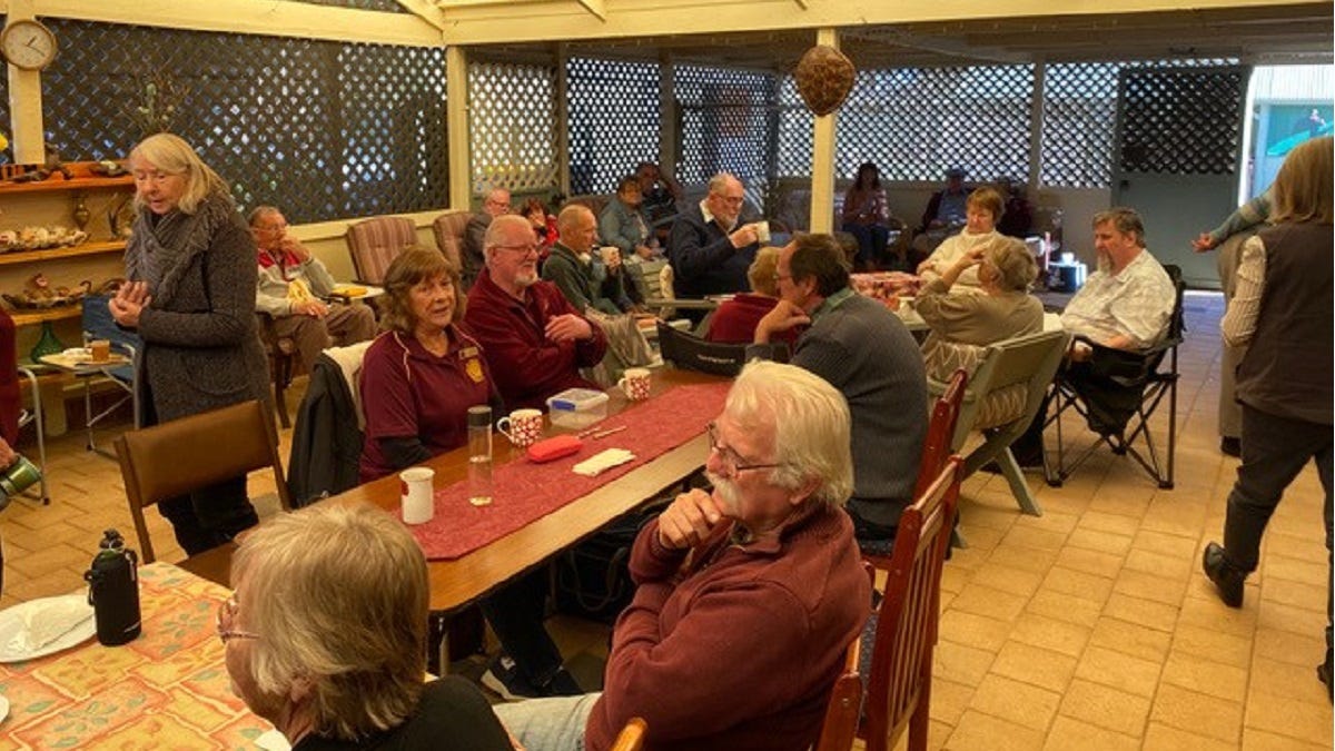 Club members have gathered at the Mabbitts' house for a Biggest Morning Tea and a sausage sizzle.