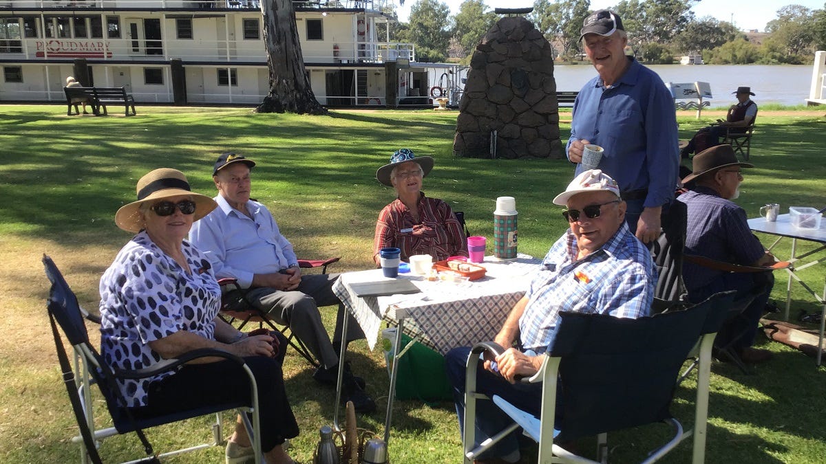As members set up their tables and chairs under shady trees, the Mobilong Rotary Club of Murray Bridge members who had been preparing lunch suddenly found a conga line of hungry participants.