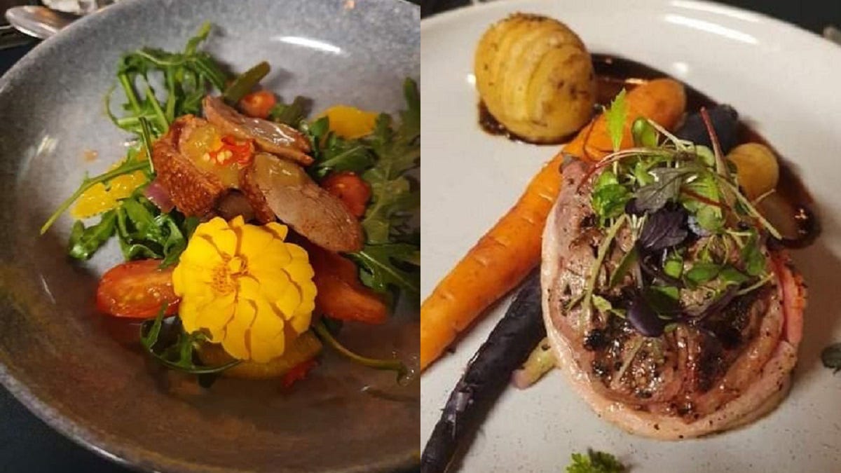 - Main: Petite fillet mignon; a 100-gram grass-fed eye fillet steak, wrapped in bacon, with hasselback potatoes and a three-coloured display of heritage carrots, accompanied by an alternate drop of mushroom sauce or red wine jus, paired with a Hahndorf Hill 2017 shiraz.