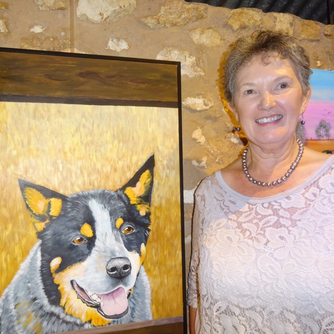 Anita Millsteed has captured the country theme with her lifelike acrylic of a blue heeler dog and a rural scene.