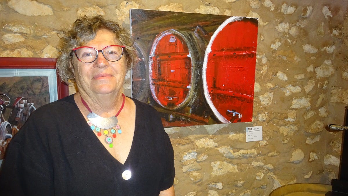 Sue Foster’s brightly coloured acrylic of wine barrels typifies the local wine-growing area.
