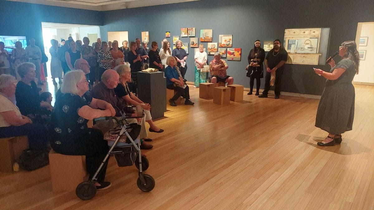 On show now are works by Kathleen Cain, Lyn Wood, Winnie Pelz and Helen Stacey; Fulvia Mantelli speaks at the exhibition opening. Images: Murray Bridge Regional Gallery, Peri Strathearn.