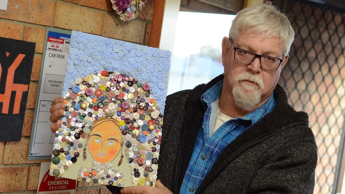 You might call him an up-and-comer on Murray Bridge’s arts scene, a creator quickly becoming known for taking unremarkable items – sequins, feathers, yes, or buttons – and assembling them into something greater than the sum of their parts.