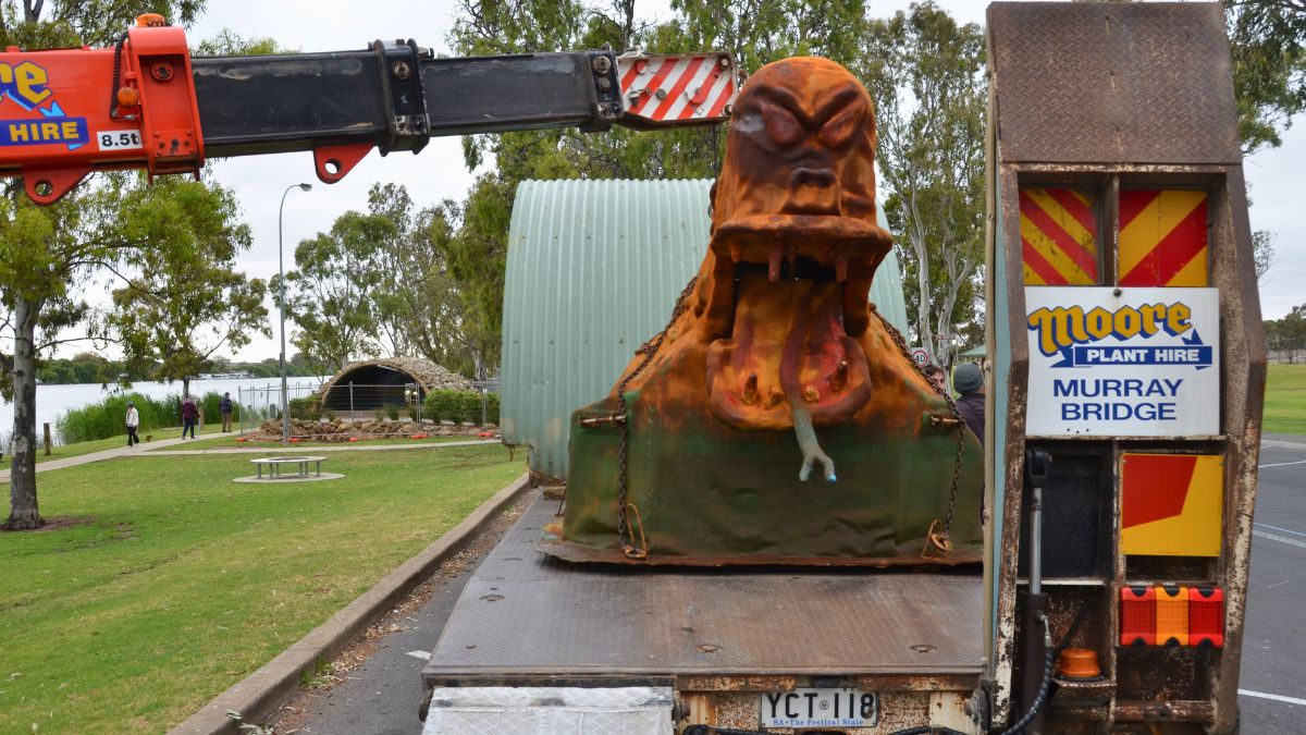 Exclusive: Murray Bridge’s Bertha the bunyip has escaped her enclosure at Sturt Reserve … Well, okay, she’s off to get repaired.