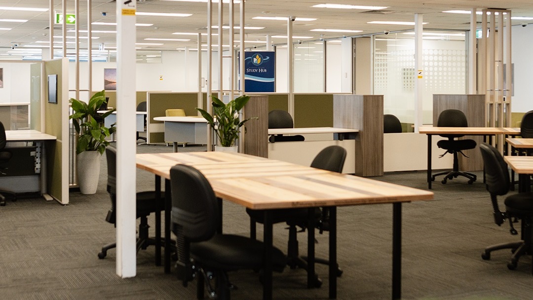 The former Centrelink building at 12 Bridge Street has been transformed into a modern, welcoming co-working space where entrepreneurs can hire a desk and students can study for free.