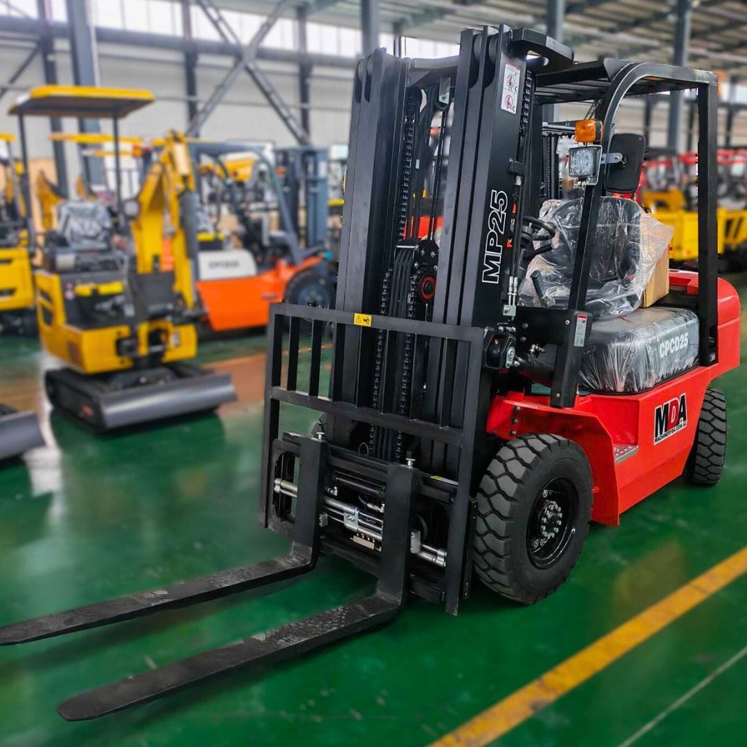 - Huayee MP25 forklift: A 2.5-tonner with a diesel engine, smooth and reliable, capable of lifting to a height of 3000–6000 millimetres for flexible stacking and loading