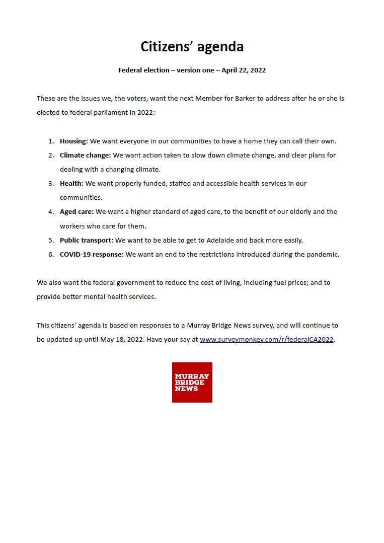 The survey will remain open until May 18, and Murray Bridge news will update the citizens’ agenda each week as new answers are added.