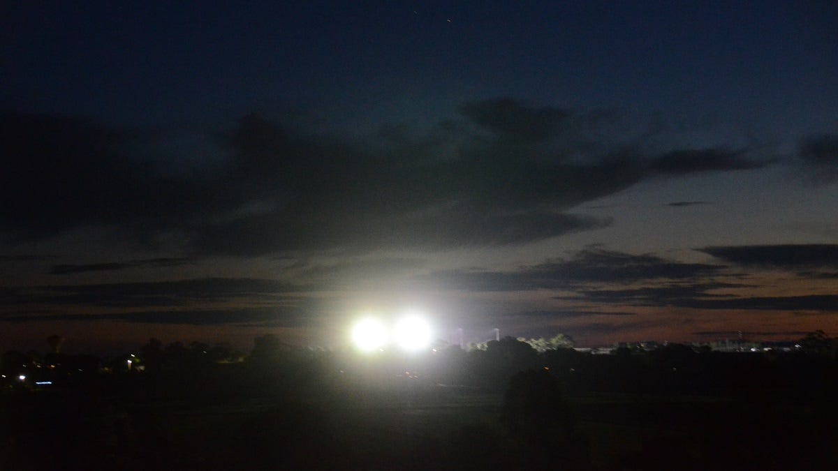 The lights at Jervois Oval illuminate the darkening sky from a distance.