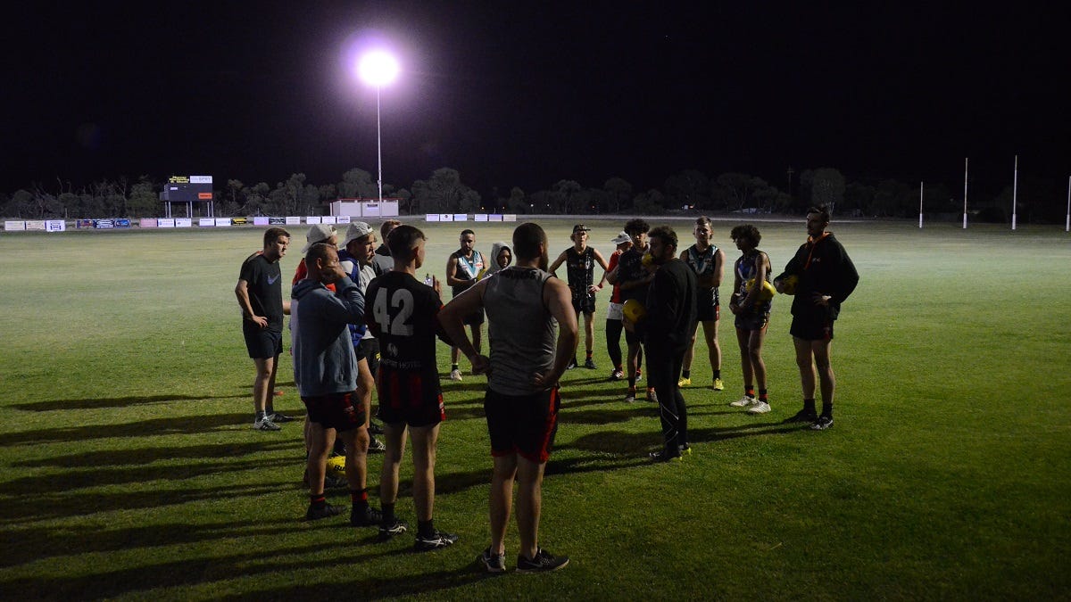 As you get closer, you can hear the young blokes calling to each other as they stretch, kick footies around and run shuttle runs.