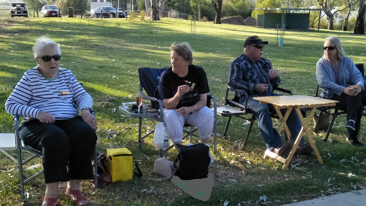 After dinner the male members ventured off to give these interesting vehicles the once-over, with many favorable comments and questions being asked of their proud owners, Mr Courtney and Mr Wilson, while the ladies sat on the reserve talking among themselves in loud voices to overcome the noisy corellas.