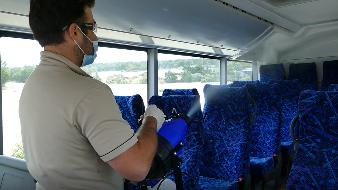 Meanwhile, Monarto Safari Park has turned to a disinfectant spray, pictured, to keep its tour buses free of COVID-19.