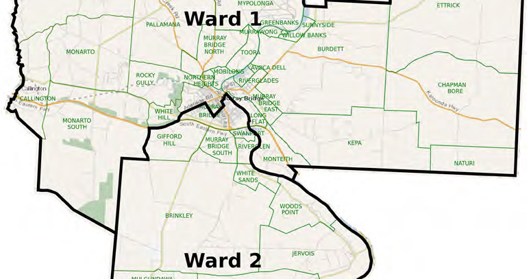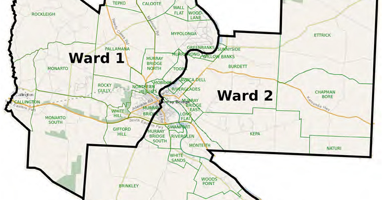 In either case, residents of Monarto, the east side and anywhere north of Adelaide Road – plus an oddly-shaped block cutting down around the old racecourse – would be in the north ward, while everyone else would be in the south ward – see below.