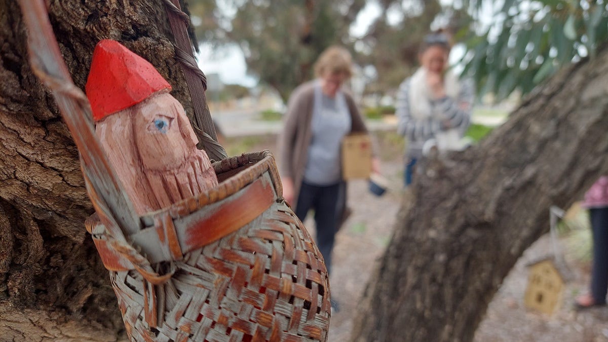 Bit by bit they placed tiny figurines, painted pebbles, pine cones and decorations of all kinds beneath the tree at the corner of Adelaide Road and Progress Drive.