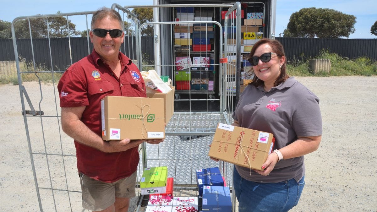 John Cirillo picks up a shoebox of love from Kimberley Cepon at Tailem Bend; more Lions cook dinner in Murray Bridge. Photo: Peri Strathearn.