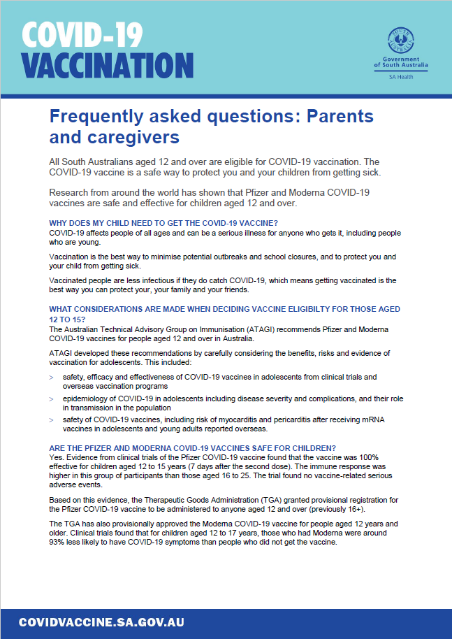 COVID-19 vaccination FAQs for parents and caregivers213KB ∙ PDF fileDownloadAll South Australians aged 12 and over are eligible for COVID-19 vaccination. SA Health says the COVID-19 vaccine is a safe way to protect you and your children from getting sick. Research from around the world has shown that Pfizer and Moderna COVID-19 vaccines are safe and effective for children aged 12 and over.Download