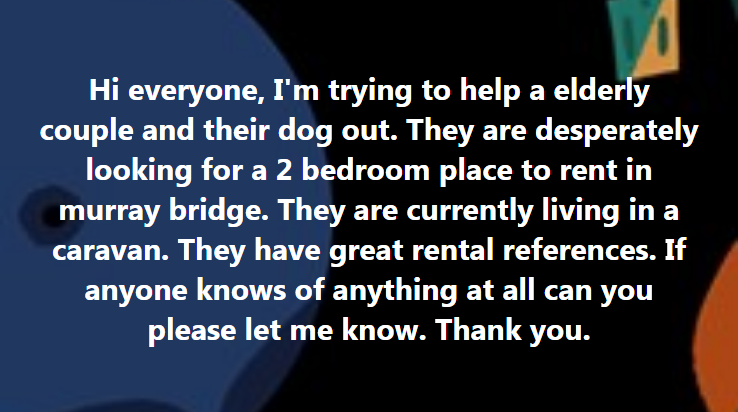“Looking for a minimum two-bedroom house to rent, needing ASAP as currently living in a family’s lounge room...”