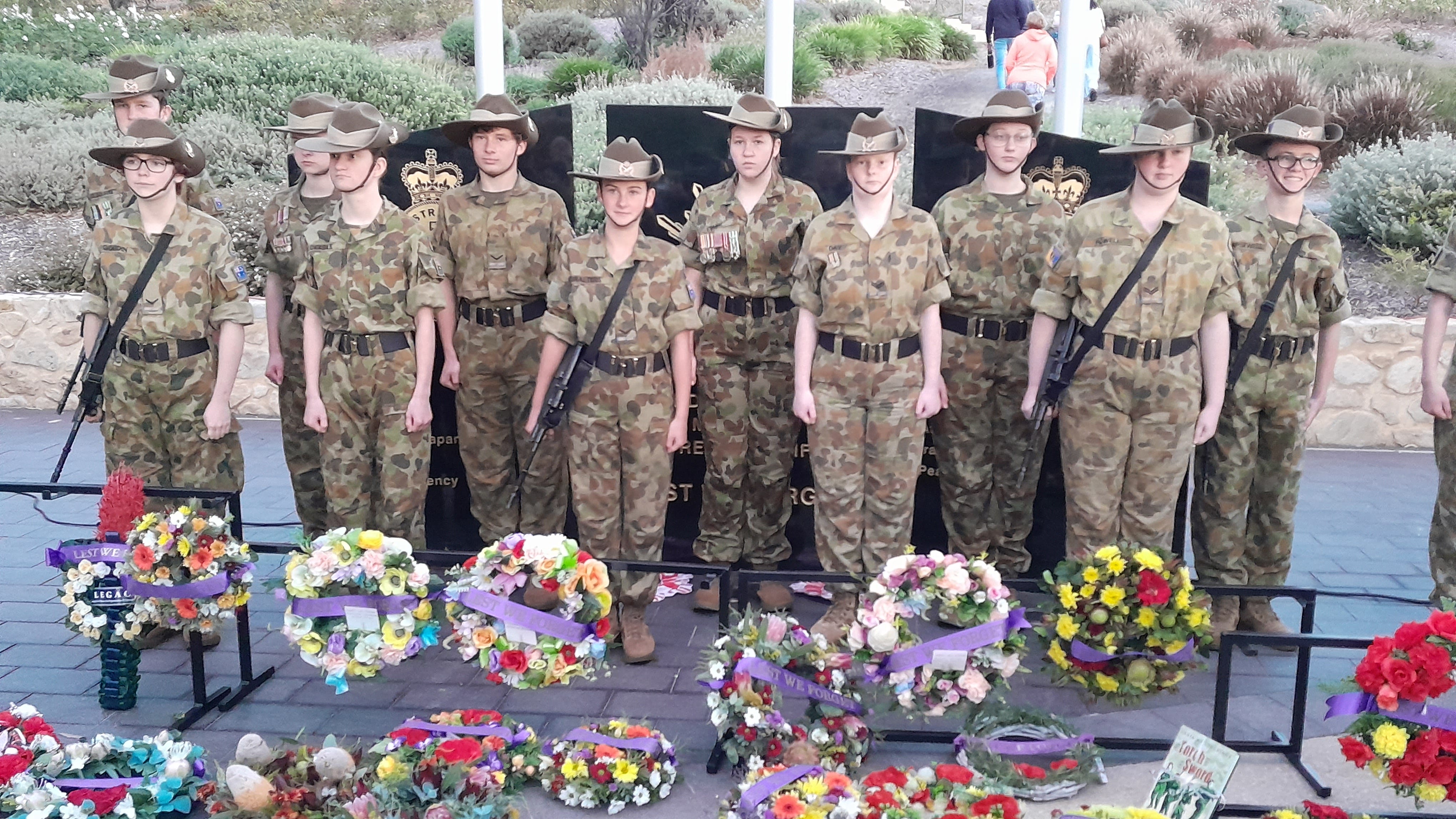 In front of about 2000 people, various RSLs, schools, politicians and their delegates laid floral wreaths at the memorial, with the 45th Army Cadet Unit marching in uniform and raising the Australian flag.