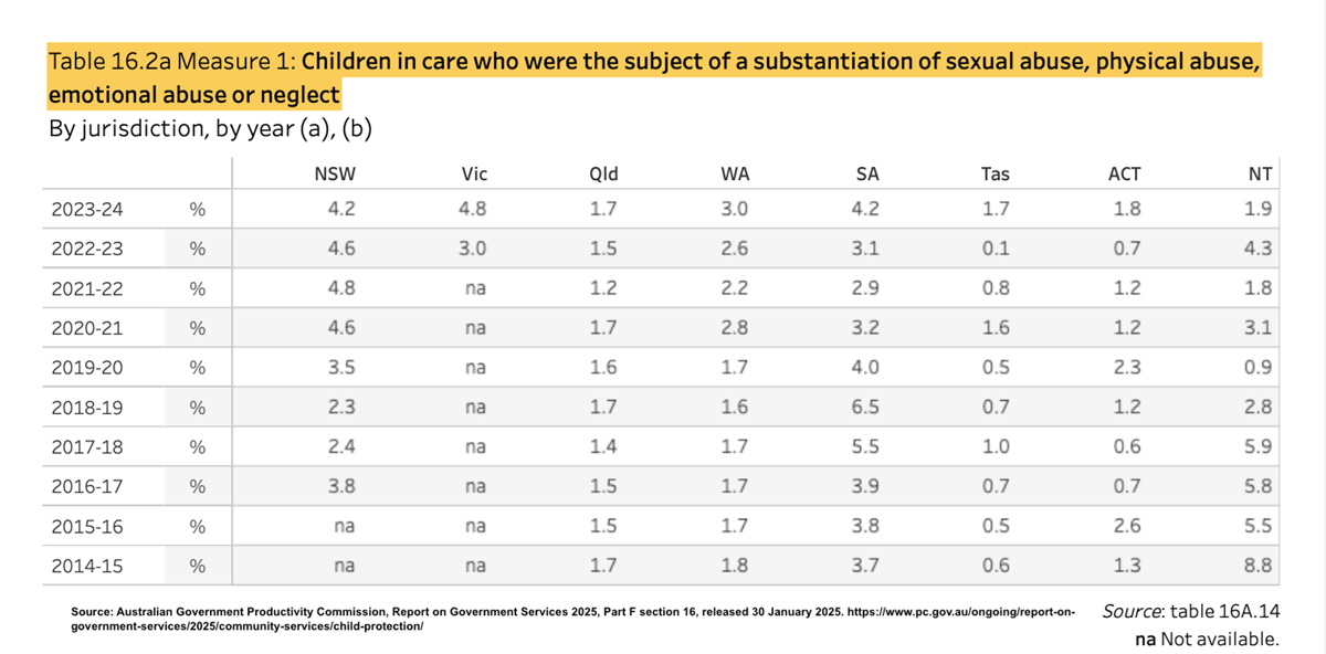 In 2023-24, 4.2 per cent of children in South Australian OOHC were the subject of substantiated abuse or neglect – a rate higher than Western Australia’s 3% and Tasmania’s 1.7%, and marking an uptick from the recent low of 2.9% in 2021-22.