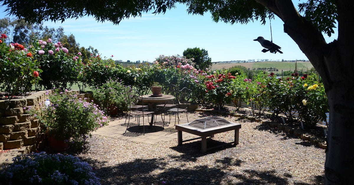 Immaculate lawn stretches down from the expansive house to a border of roses – about 180 varieties in all, in pink and gold, scarlet and white – and beyond them a view down to the river flats and the Murray.