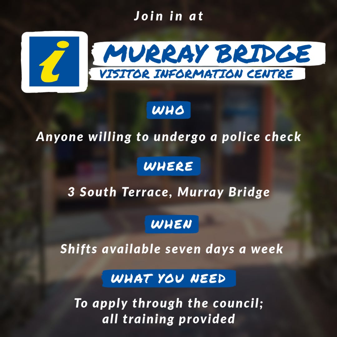 - More information: For the visitor information centre, visit www.murraybridge.sa.gov.au; or to volunteer with the Rural City of Murray Bridge, visit www.murraybridge.sa.gov.au or contact Ngareta Cronin on 8539 1132 or at n.cronin@murraybridge.sa.gov.au.