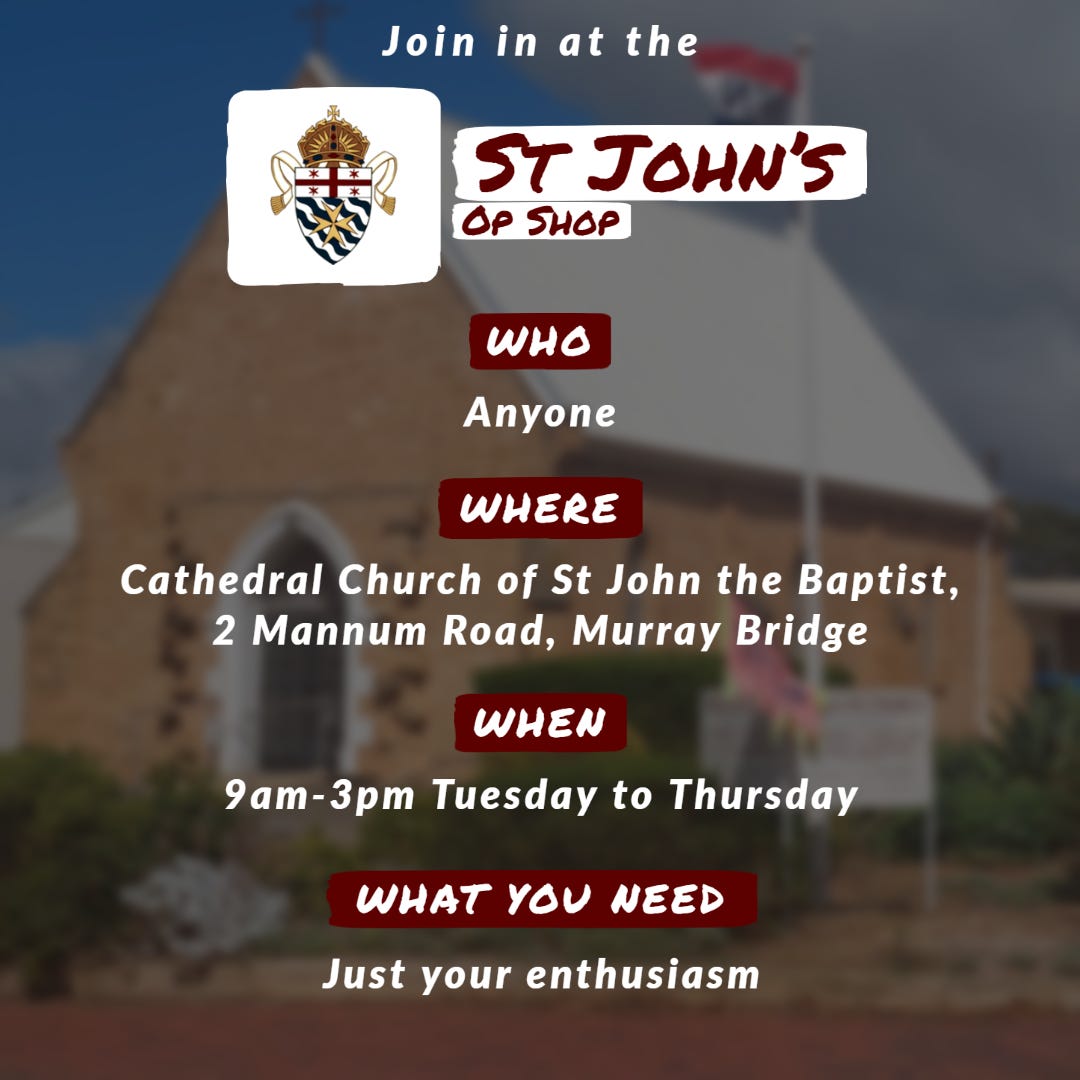 - More information: Phone Deb Northcott on 0412 844 145, email debranorthcott14@gmail.com or visit the St. John’s Op Shop Facebook page.