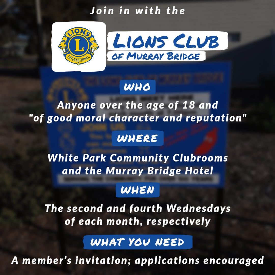 - More information on the Lions Club of Murray Bridge: Call club president Hylton Moritz on 0408 803 723, email lionsmurraybridge@gmail.com or visit murraybridge.sa.lions.org.au.