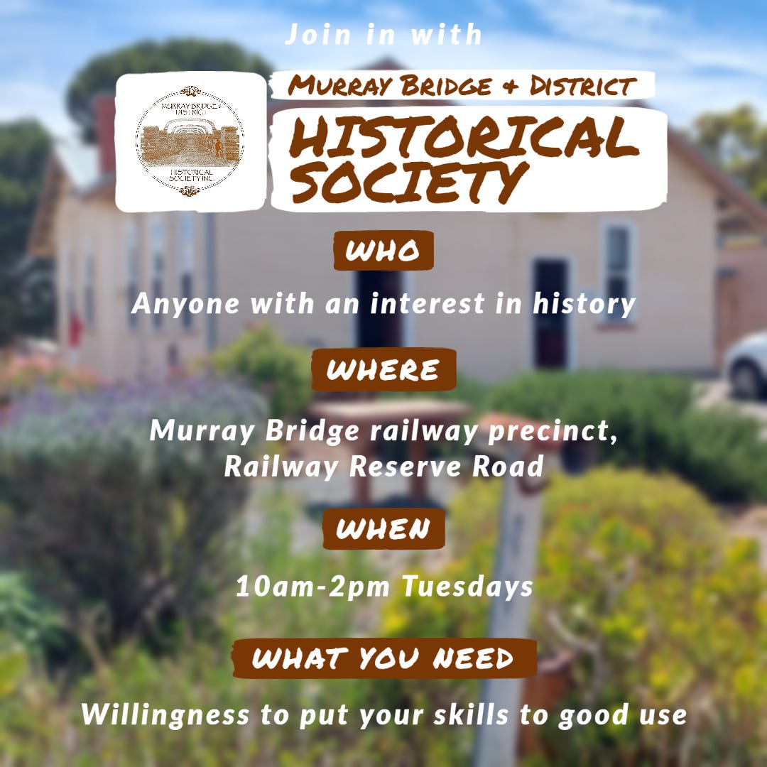- More information: Search for Murray Bridge and District Historical Society Inc on Facebook or email mbhistorical@hotmail.com.