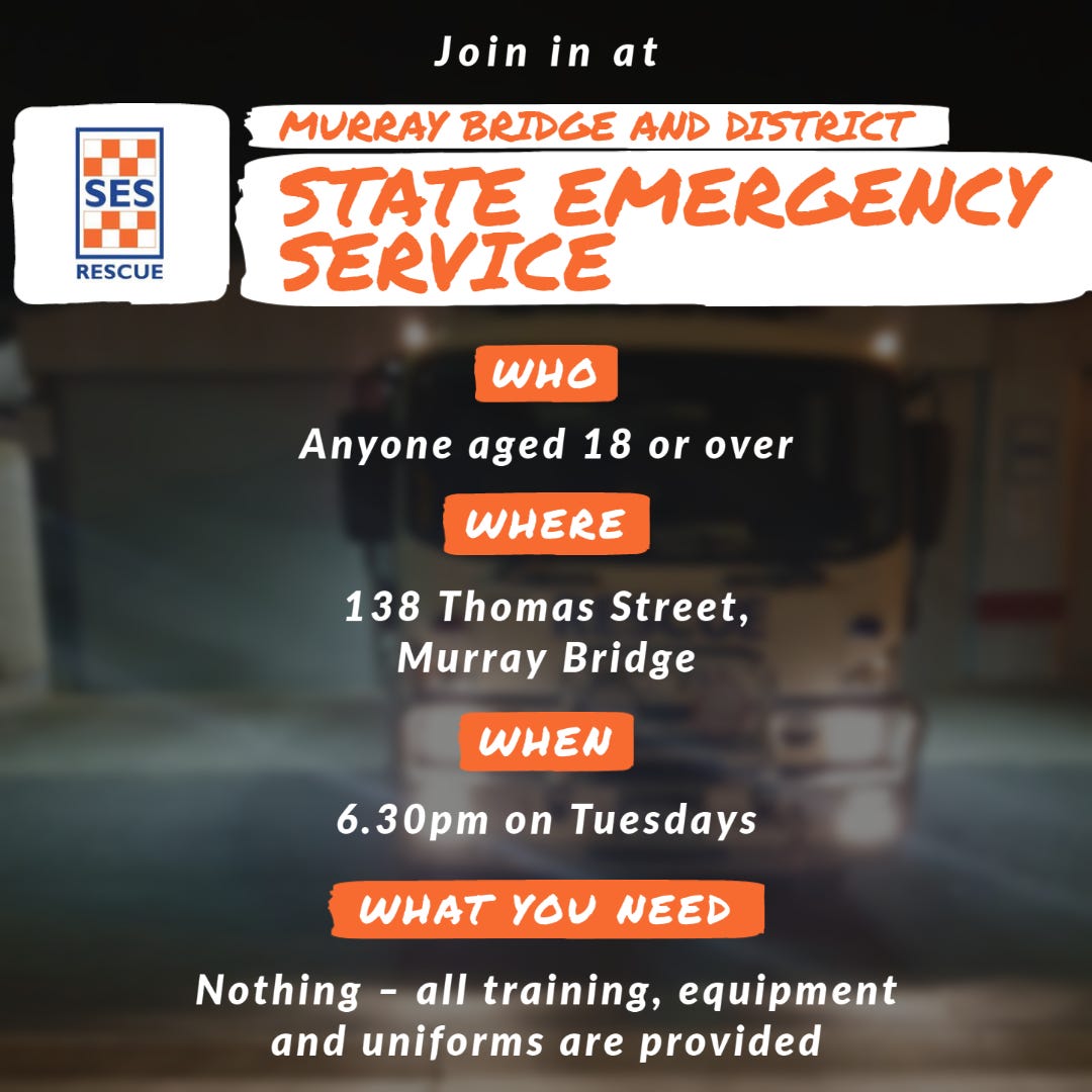 - More information: Visit www.ses.sa.gov.au or search for the Murray Bridge and Districts State Emergency Service on Facebook.