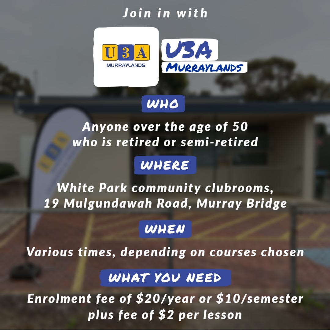 U3A Murraylands is a not-for-profit organisation that offers educational courses for people who are over 50, and either retired or semi-retired.