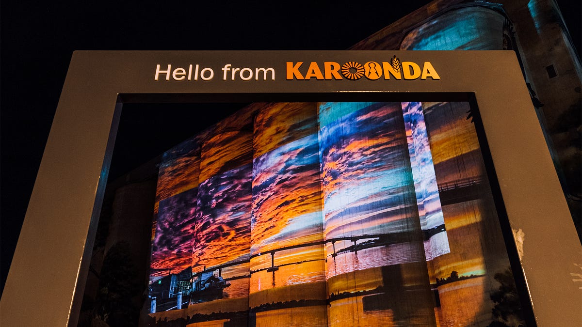 As evening darkness fell, it was back to the main street of Karoonda to view the evening’s light show on the silos by artist Stephen Trebilcock, depicting native flora and fauna.