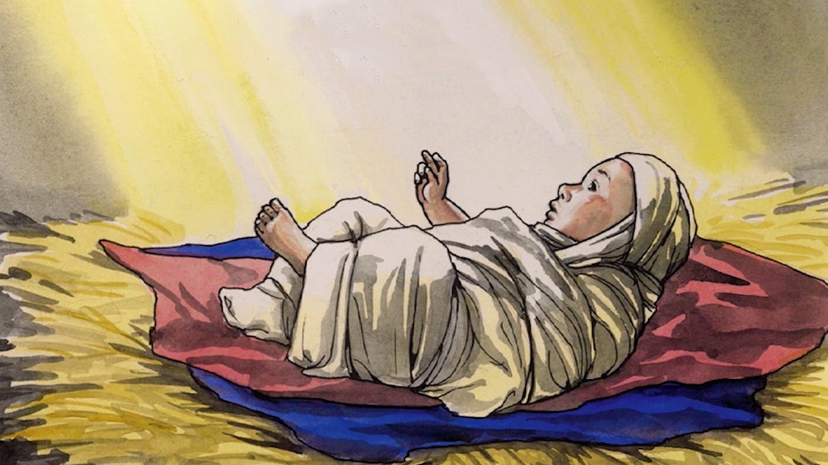 His mother wrapped him in some cloths and gently laid him on some straw in a feeding manger.