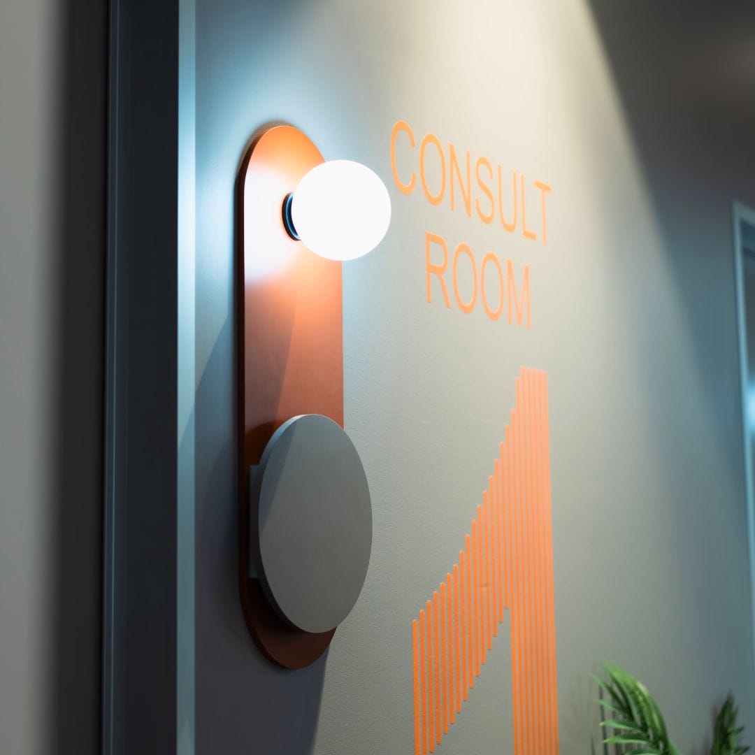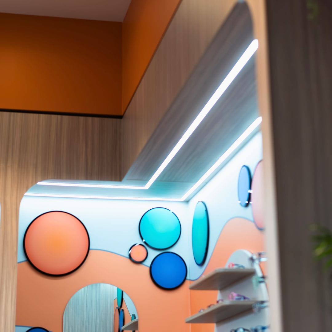 A variety of lighting styles, combined with the business’ orange and grey colour palette, focuses the eye on features around the optometrists’ space.