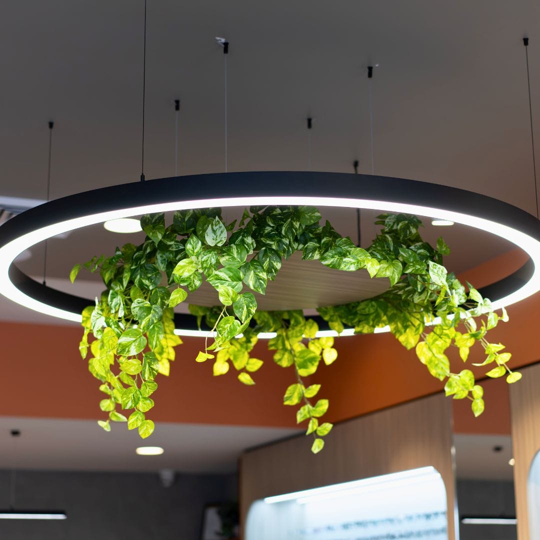 Ring lights highlight greenery, LED strips along the walls shine down on product displays, and soft globes guide your way into consulting rooms.