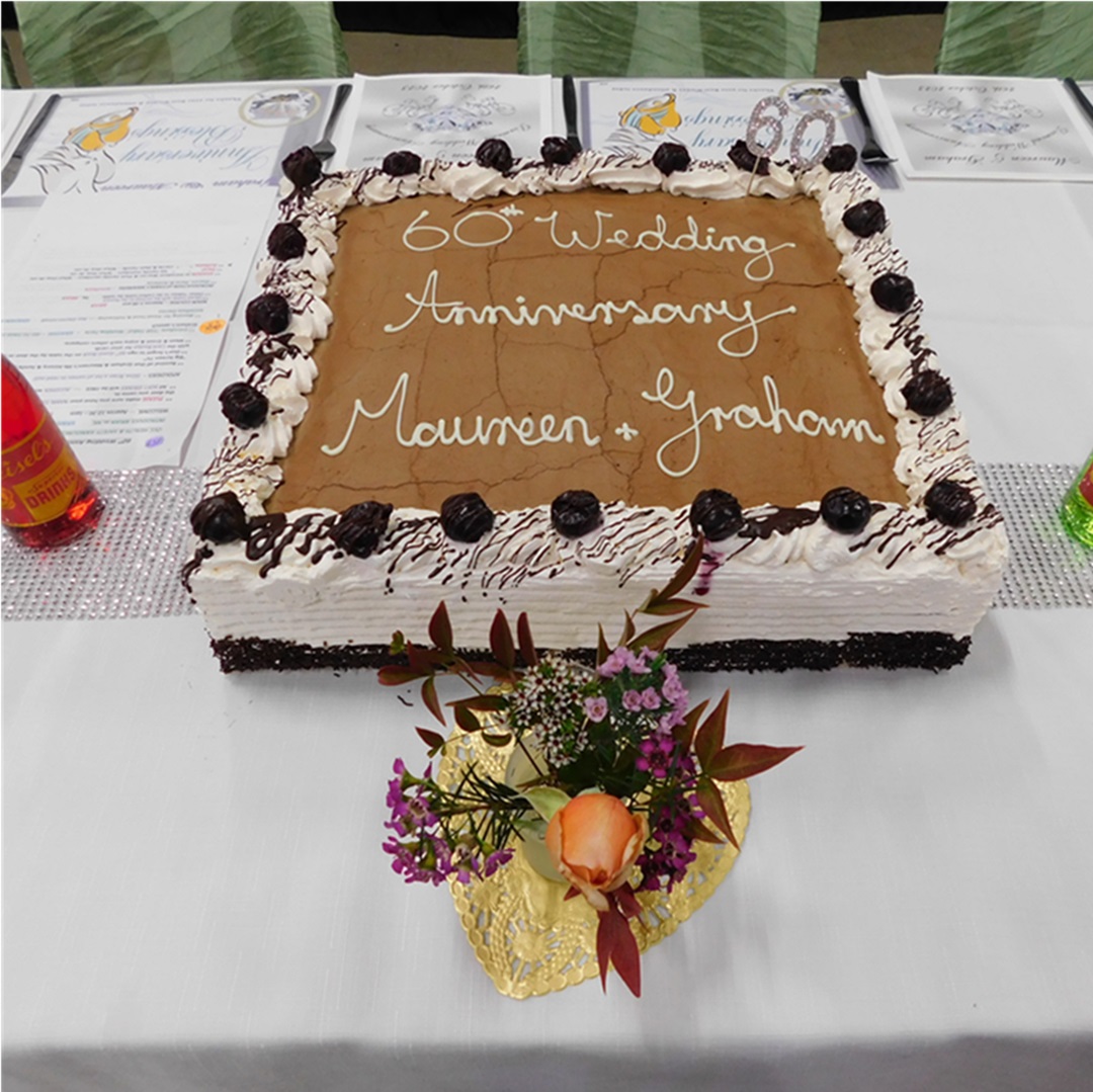 At this point, MC Brian Edwards gave his recollections of some of his and Graham’s humorous “past years” as young lads before their marriages, then proposed a toast to the “bride and groom of 60 years” and asked all to drink a toast in their honour. This was followed by the cutting of the cake (with a replica version of their original cake watching on).
