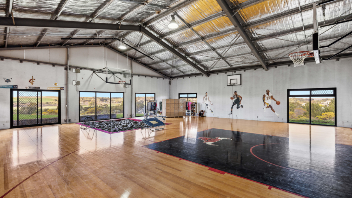 But what will really wow you are the indoor lap pool and spa, full-size tennis court, netted cricket pitch and – most impressive of all – an indoor basketball stadium and dunk pit.