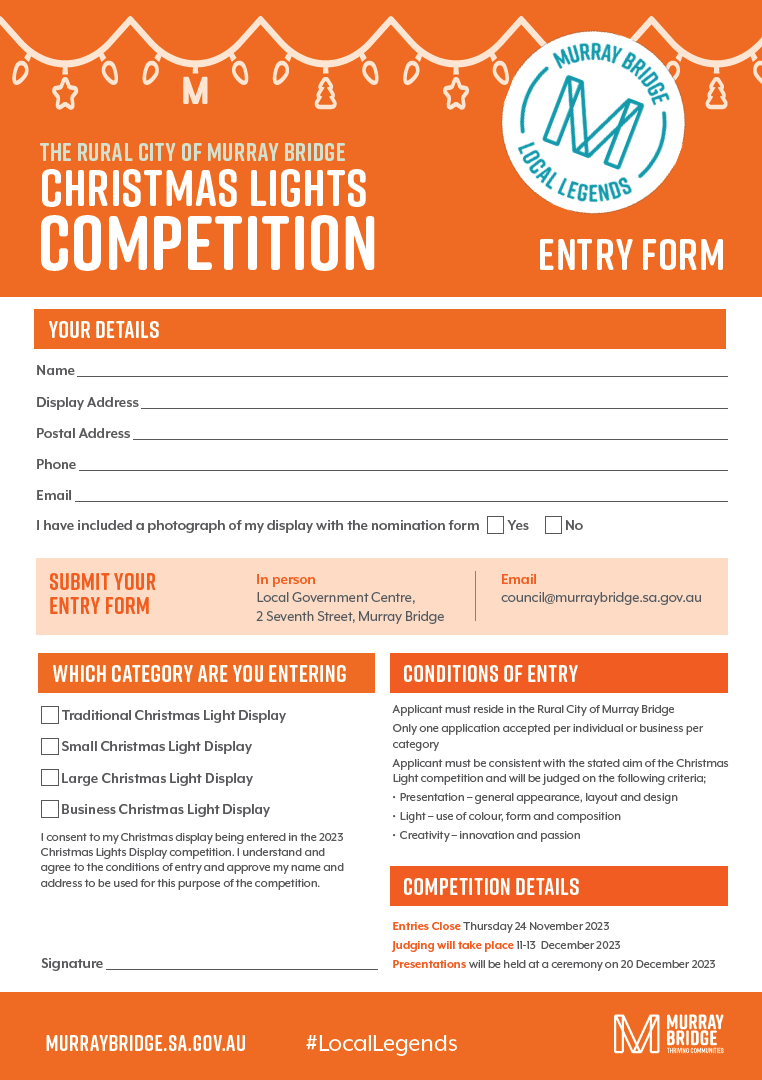 Entry forms and guidelines are now available at the local government centre and Murray Bridge Library, or online at www.murraybridge.sa.gov.au/christmaslights.