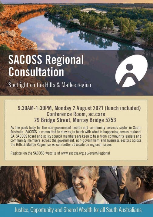 The South Australian Council of Social Service (SACOSS), the peak body for non-government health and community services sector, will be holding a regional consultation on Monday August 2 with CEO Ross Womersley attending.