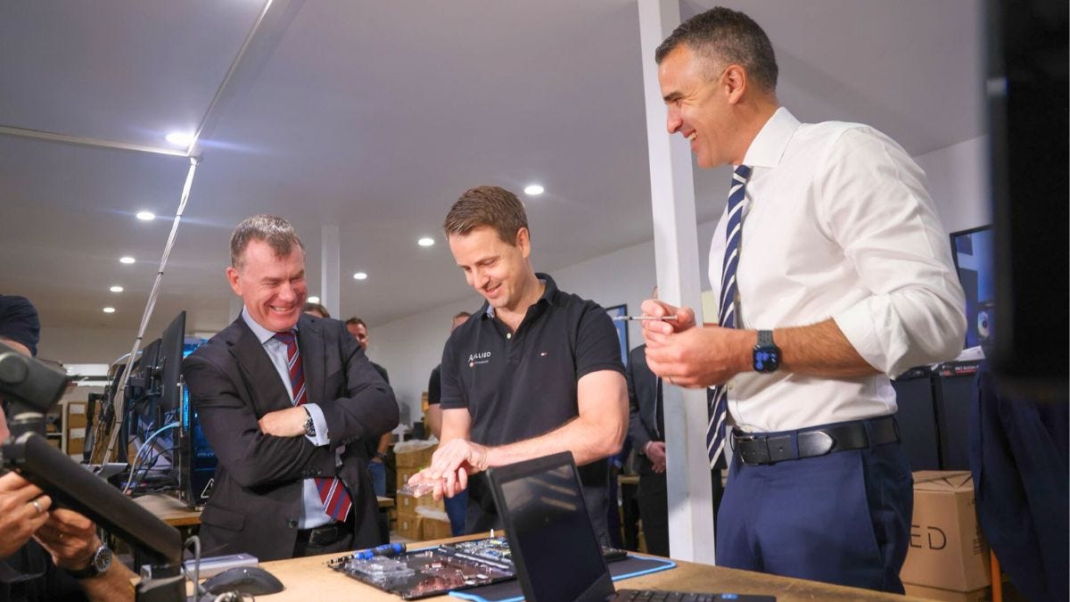 An Allied employee shows Nick Champion, left, and Peter Malinauskas, right, how the laptops will be built. Photo: Peter Malinauskas/X.