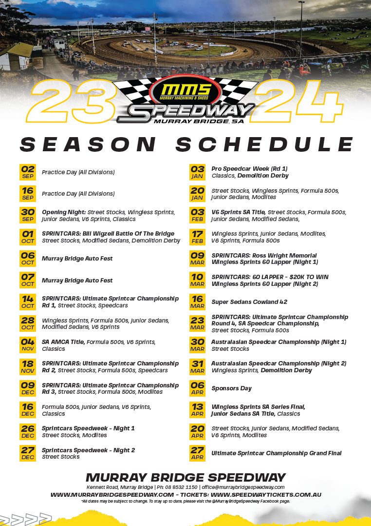 Murray Bridge Speedway has announced its upcoming race dates for the 2023-24 season.
