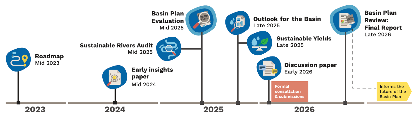 - Early 2026: A discussion paper will explore the issues facing the basin plan in more detail; a round of public consultation will follow