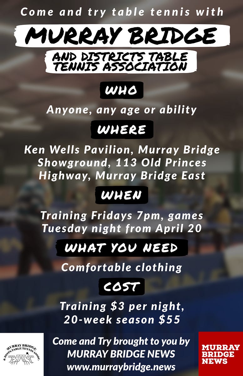 - More information: Visit murraybridgetabletennis.org or search for Murray Bridge and District Table Tennis Association on Facebook.