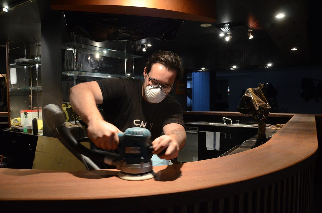 The buzz is literal – it's a power sander being used to restore the saloon bar top to its original jarrah wood.