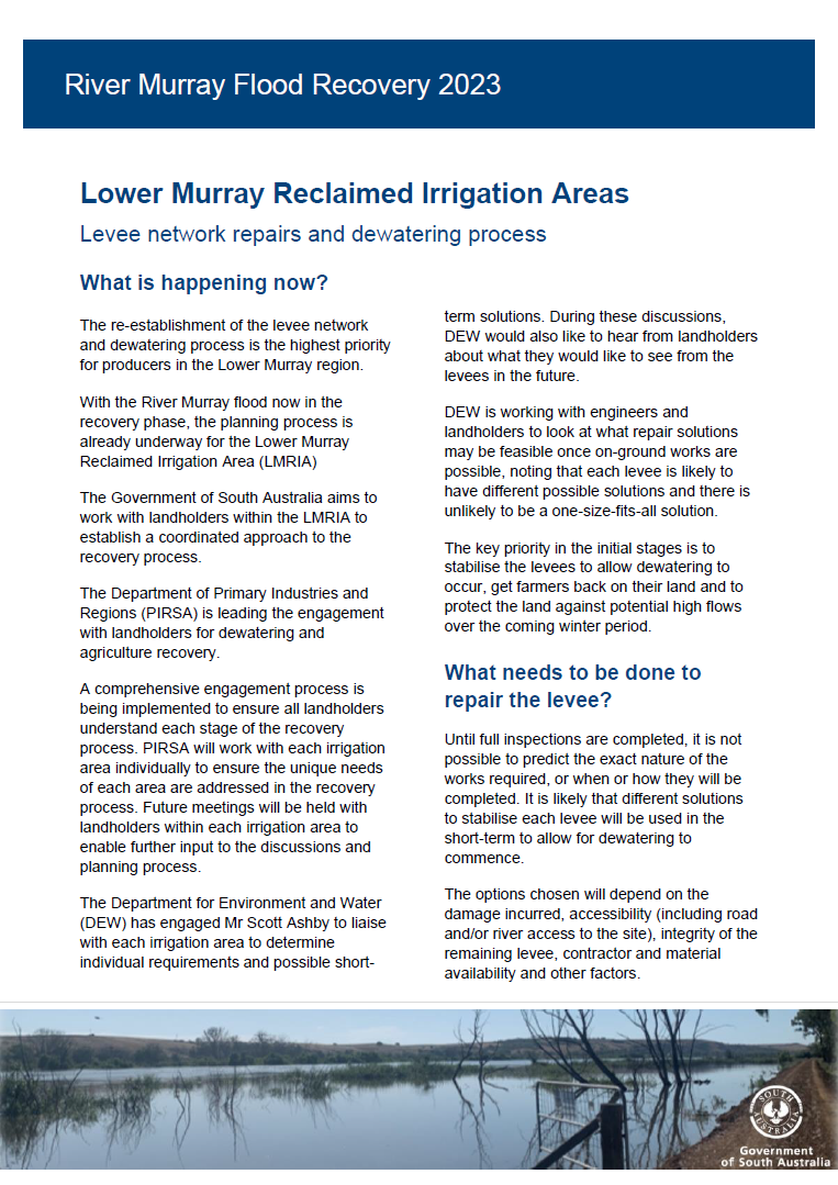 “The re-establishment of the levee network and the de-watering process is the highest priority for primary producers in the Lower Murray region,” Ms Scriven said.
