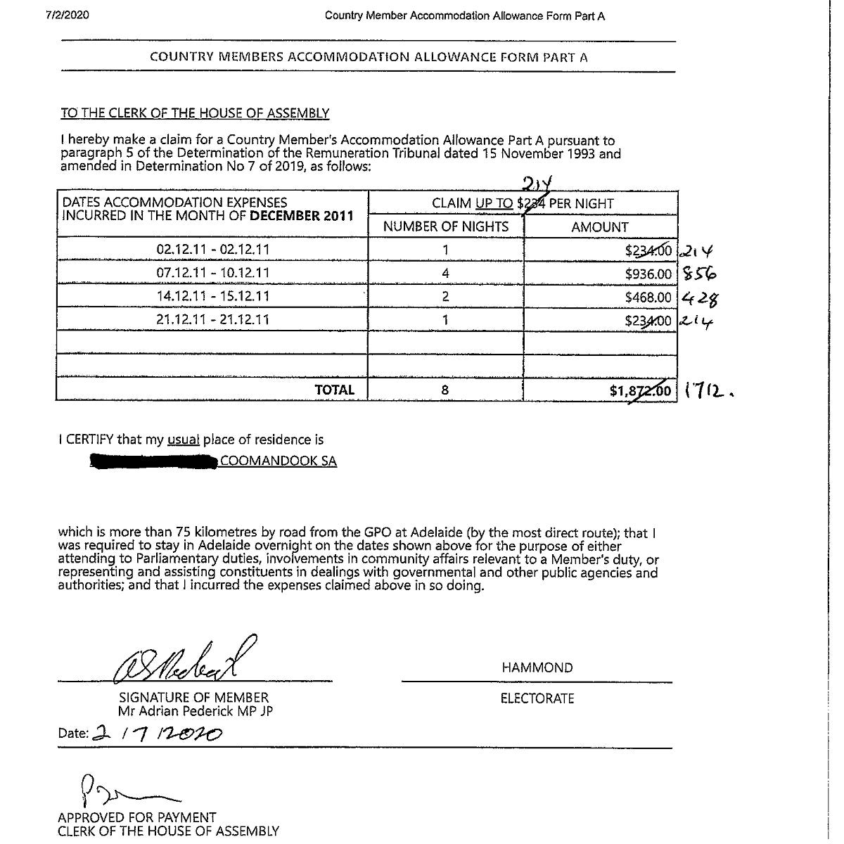 Photo: Peri Strathearn. Image of Mr Pederick’s amended claim form for December 2011: Parliament of South Australia.