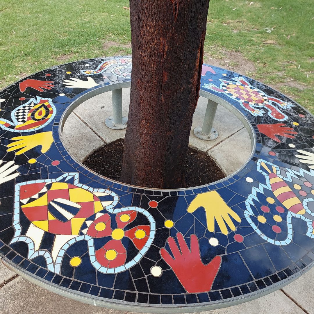 Associated with this is a set of two circular mosaic seat sculptures created by a number of Aboriginal artists, including younger members of the local Aboriginal community.