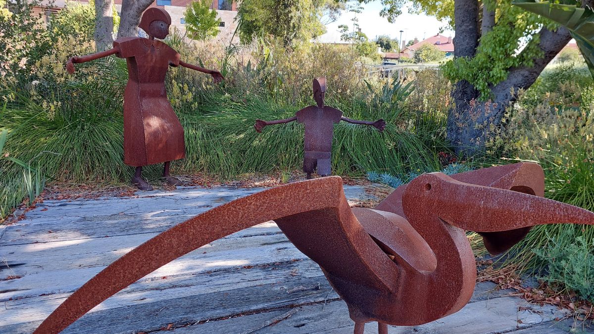 The weathered corten metal figures contained within Dream on Flight depict a pelican, child and grandmother, while the wooden platform on which they stand represents the riverside lifestyle of a River Murray wharf.