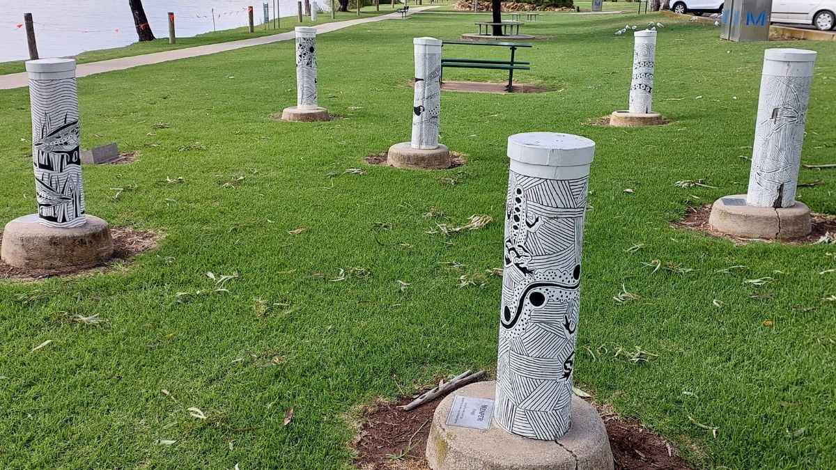 These sculpted wooden bollards were created by members of the local Aboriginal community, symbolising a number of aspects of its culture.