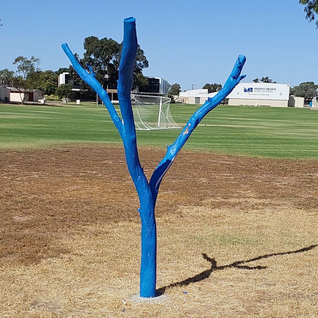 Next stop is outside the Murray Bridge High School oval on the right-hand side of Swanport Road, where a simple blue tree sculpture sits.