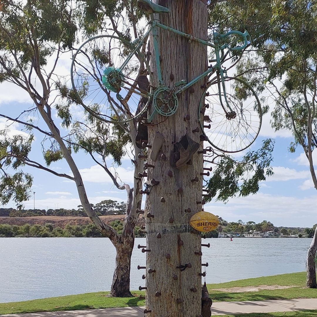 Riding a little further along the pathway brings cyclists to a truly emblematic sculpture, the Traveller’s Totem, constructed in 2016 and consisting of a timber pylons reminiscent of the paddleboat wharfs dotted along the Murray, impregnated with railway dog spikes that were once used in the vast railway network servicing River Murray ports.